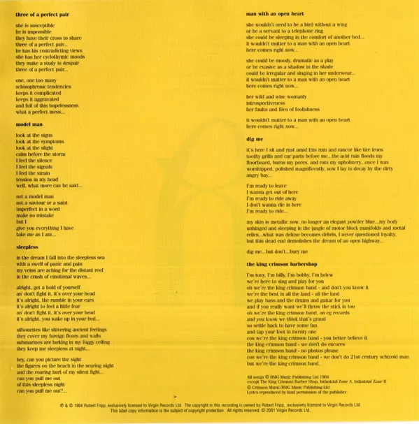 ℗ & © 1984 Robert Fripp, exclusively licensed to Virgin Records Ltd. The copyright in this recording is owned by Robert Fripp, exclusively licensed to Virgi