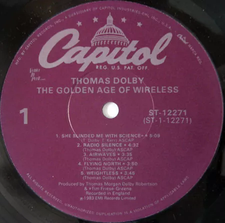 Earlier Jacksonville (O) reissue variant with purple labels. This re-issue contains the Extended Version of "She Blinded Me With Science" and the Single Edits for "Airwaves" & "Windpower".