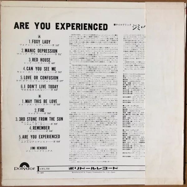 Manufactured by Nippon Grammophon Co., Ltd., Japan. Obi strip titled in Japanese "Psychedelic Jimi Hendrix". Priced ¥1750.