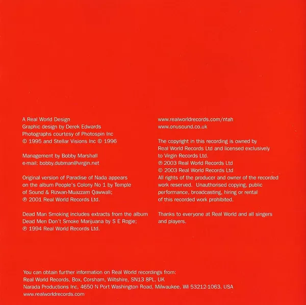Original version of track 7, "Paradise Of Nada", appears on the album [url=/master/345313]People's Colony No 1[/url] by [a51945] & [a242744] ℗ 2001 Real World