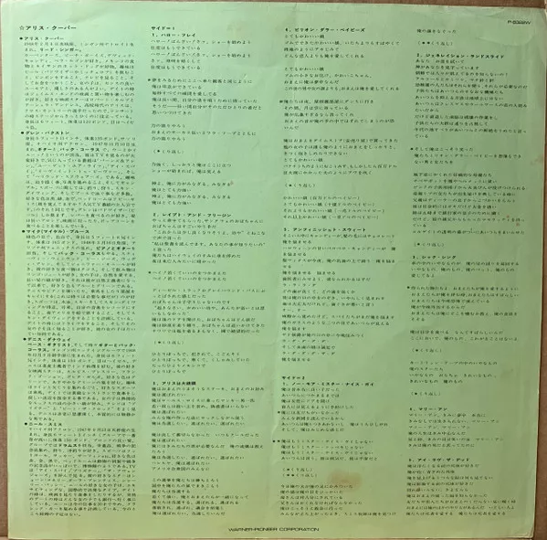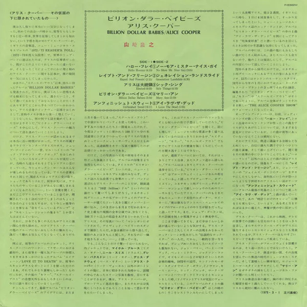 Issued in embossed gatefold sleeve with rounded corners, obi, Japanese lyric/liner-note insert, printed inner sleeve with English lyrics, a billion dollar banknote, and in earliest copies a color poster of Alice.