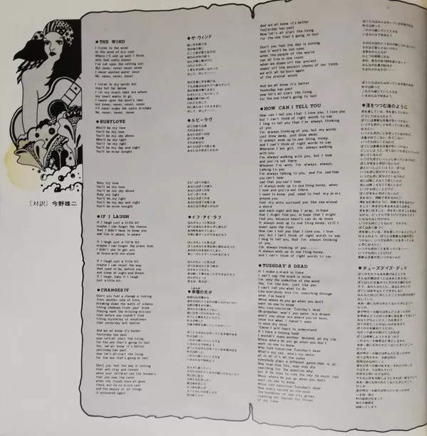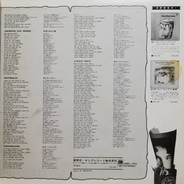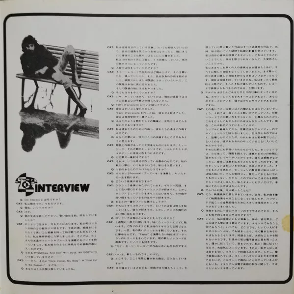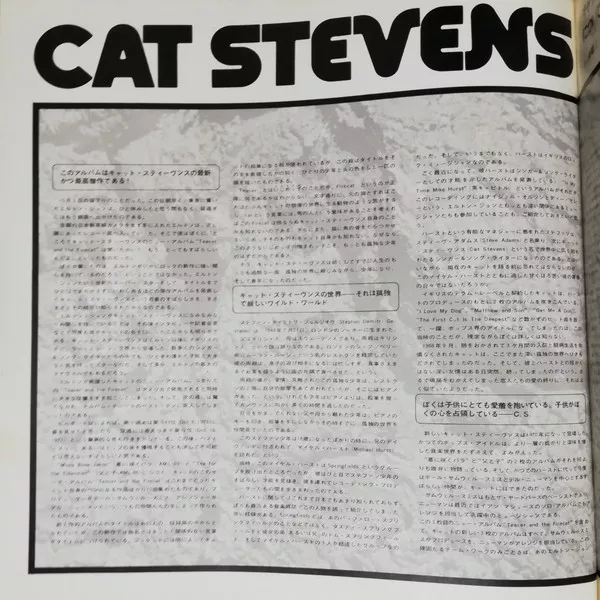 Matte gatefold with obi and 7-page insert glued to inside of gatefold. The insert has both Japanese and English tracklistings (page 1), Japanese language Cat Stevens memo (page 2), biography (page 2), interview (page 3) and liner notes (pages 4 and 5) and