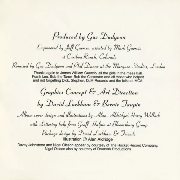 All selections written by Elton John and Bernie Taupin and published by Big Pig Music, Ltd./Leeds Music Corp., ASCAP.
