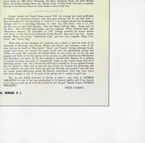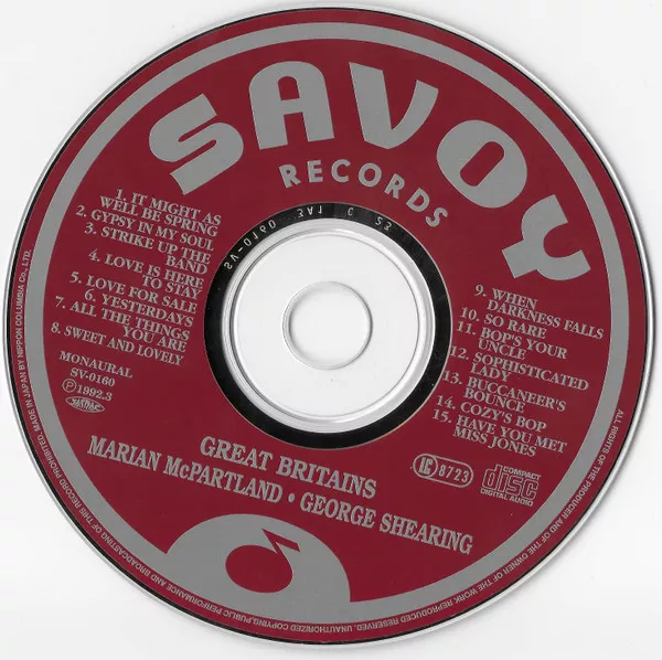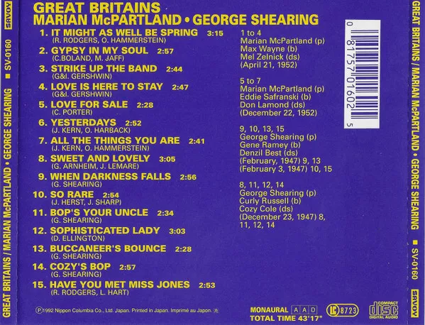 Split release with McPartland on tracks #1-7 and Shearing on tracks #8-15. This edition has black and white photos of each artist on front cover. Includes folded 4-pages inlay.